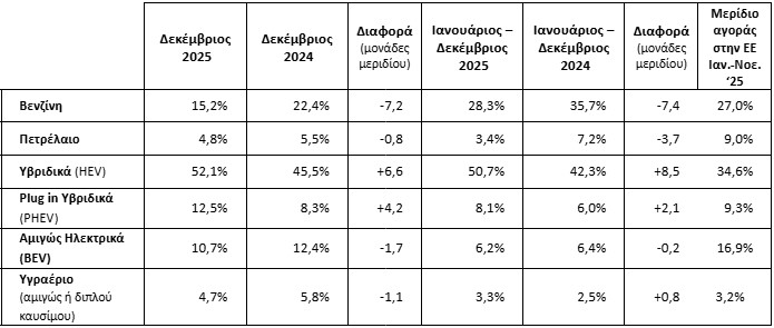 Αντίθετα, σημαντική αύξηση παρουσιάζουν τα υβριδικά και plug in υβριδικά μοντέλα, με το μερίδιό τους συνολικά να φτάνει το 58,8% επί των νέων οχημάτων στο 12μηνο, έναντι του 48,3% το προηγούμενο έτος. Σε ότι αφορά τα ηλεκτρικά (BEV), το ποσοστό τους μειώθηκε ελαφρώς στο 6,2%, από 6,4%. Αναλυτικά, οι ταξινομήσεις του 2025 τον περασμένο μήνα και από την αρχή του έτους, παρουσιάζονται στον παρακάτω πίνακα.