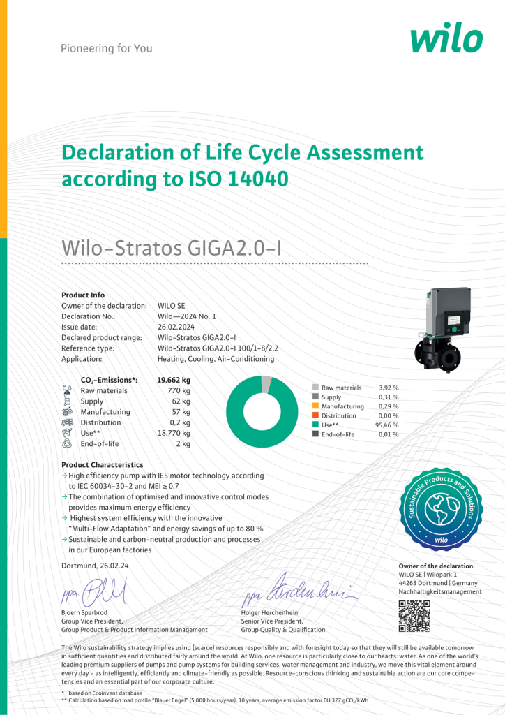Η εξοικονόμηση ενέργειας στη λειτουργία είναι μόνο ένα κομμάτι της βιωσιμότητας. Η Wilo αξιολογεί ολόκληρο τον κύκλο ζωής των προϊόντων της (Life Cycle Assessment – LCA), από την παραγωγή και τη μεταφορά μέχρι τη λειτουργία, τη συντήρηση και την ανακύκλωση.