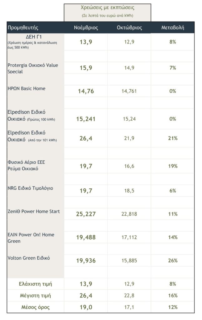 Επίσης, σύμφωνα με τις χρεώσεις όπως αυτές είχαν αναρτηθεί στον εργαλείο energycost της Ρυθμιστικής Αρχής (ΡΑΑΕΥ), η μέση τιμή στα πράσινα τιμολόγια Νοεμβρίου διαμορφώνεται στα 19 λεπτά ανά κιλοβατώρα. Αυτό σημαίνει πως σε μηνιαία βάση σημειώνεται αύξηση 12%, καθώς η μέση τιμή τον Οκτώβριο είχε διαμορφωθεί στα 17,1 λεπτά ανά kWh.