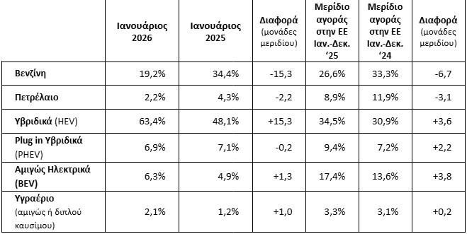 Υβριδικά μοντέλα αποτέλεσαν τη συντριπτική πλειοψηφία των καινούριων οχημάτων για τον Ιανουάριο, αντιπροσωπεύοντας το 63,4% των ταξινομήσεων.