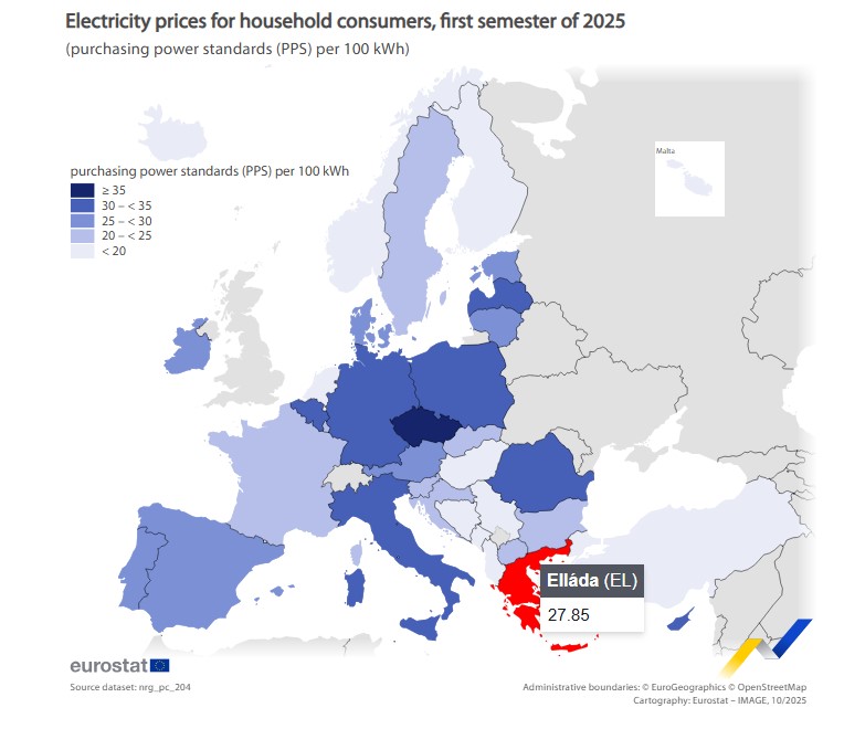 Στα 278,5 ευρώ/MWh διαμορφώθηκε ο μέσος λογαριασμός ρεύματος που πλήρωσαν τα νοικοκυριά στη χώρα μας το πρώτο εξάμηνο του 2025, σύμφωνα με στοιχεία που παρουσίασε η Eurostat.