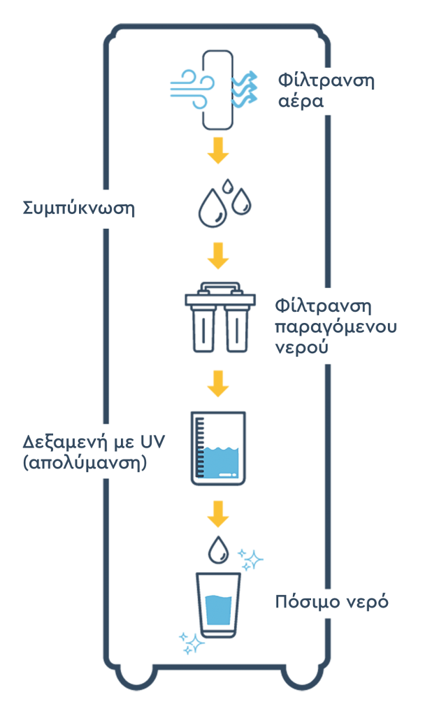 Συλλογή υγρασίας από τον αέρα – Ο ατμοσφαιρικός αέρας εισάγεται στη μονάδα και οδηγείται σε ειδικά ψυκτικά συστήματα, όπου η υγρασία συμπυκνώνεται σε υγρή μορφή.