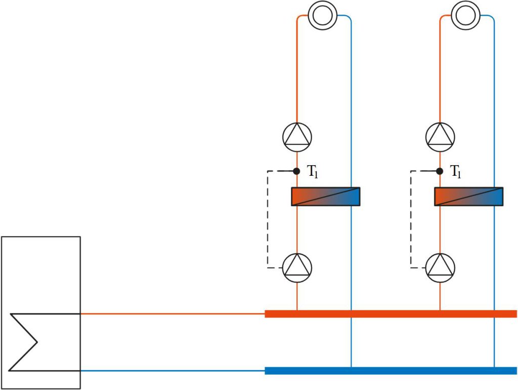 Το Multi‐Flow Adaptation αφορά αντλίες σε συστήματα με πρωτεύον και δευτερεύον κύκλωμα, με υδραυλικό διαχωρισμό ή συμβατικό εναλλάκτη θερμότητας. Η αντλία του πρωτεύοντος κυκλώματος συλλέγει μέσω θύρας Wilo‐Net τα δεδομένα παροχής από όλες τις δευτερεύουσες αντλίες και προσαρμόζει αθροιστικά την παροχή της στο άθροισμα των απαιτήσεων.