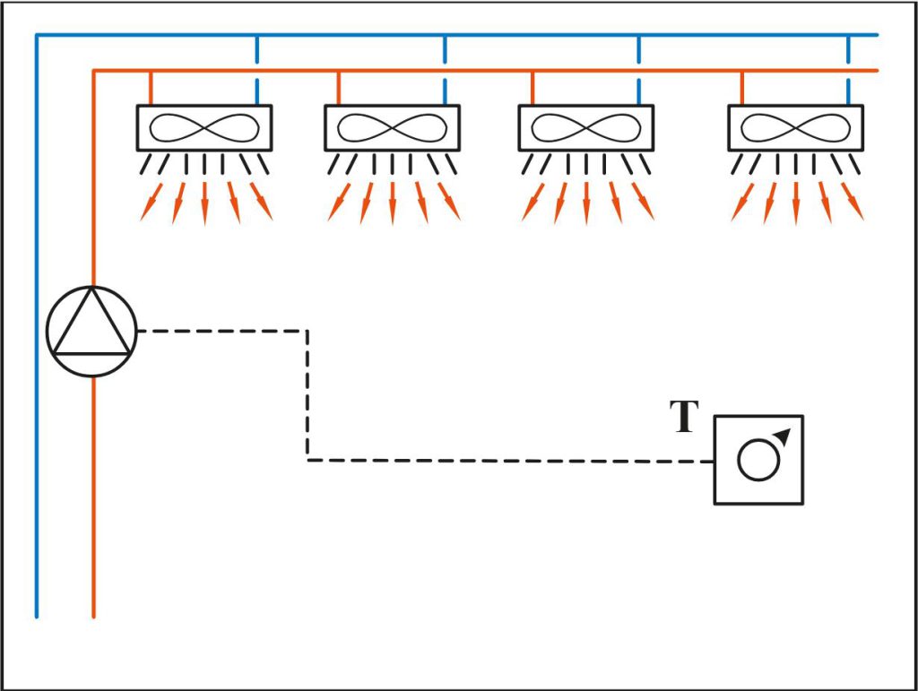 ⇒ Μεγάλοι ενιαίοι χώροι (π.χ. αίθουσες, αθλητικοί χώροι, βιομηχανικοί χώροι) όπου δεν υπάρχουν θερμοστατικές βαλβίδες στις τερματικές μονάδες.