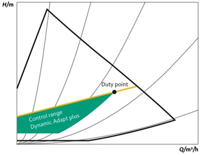 Τo Dynamic Adapt Plus αποτελεί εξέλιξη της κλασικής ρύθμισης μεταβαλλόμενης πίεσης (Δp‐v). Η αντλία προσαρμόζει αυτόνομα το μανομετρικό και την παροχή χωρίς να απαιτείται η γνώση του ακριβούς μοντέλου του υδραυλικού κυκλώματος και η εισαγωγή του ονομαστικού σημείου λειτουργίας από τον εγκαταστάτη.