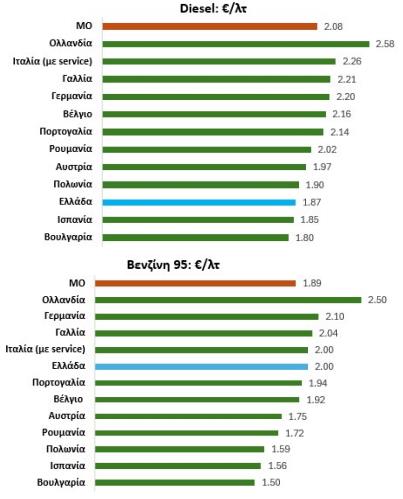 Από τη σύγκριση των τιμών πρατηρίων για αμόλυβδη 95 και diesel προκύπτει ότι η Ελλάδα καταγράφει από τις χαμηλότερες αυξήσεις μεταξύ των χωρών της Ευρωζώνης. Ιδιαίτερα στο diesel, η χώρα μας παρουσιάζει τη δεύτερη (2η) χαμηλότερη αύξηση τιμών, ενώ στην αμόλυβδη κινείται κοντά στον μέσο όρο της Ευρωζώνης.